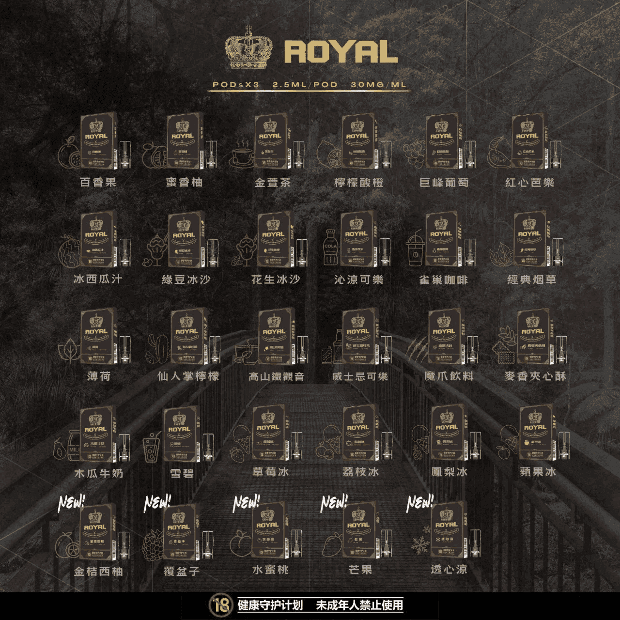 | 口味 | 仙人学桲檬, 木瓜牛奶, 紅心芭樂, 草莓冰, 金萱茶, 魔爪歆料, 冰西瓜汁, 檸檬酸橙, 經典菸草, 荔枝冰, 雀巢咖啡, 鳳梨冰, 威士忌可樂, 巨峰葡萄, 沁涼可欒, 百香果, 綠豆冰沙, 花生冰沙, 薄荷, 蘋果冰, 蜜香柚, 雪碧, 高山鐡觀音, 麥香夾心酥 |